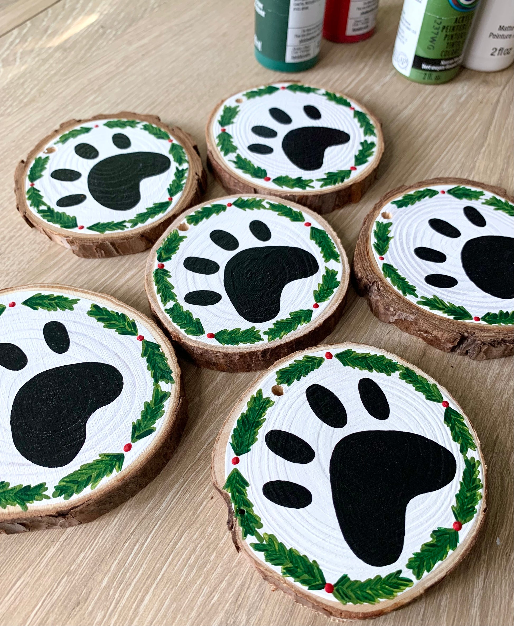 Each ornament is hand-painted on strong, lightweight wood rounds (approximately 2.4” - 2.8” in diameter and .4” thick). The front of the ornaments are painted in acrylic and finished with a clear protective coat. The back is left blank with a natural wood finish.